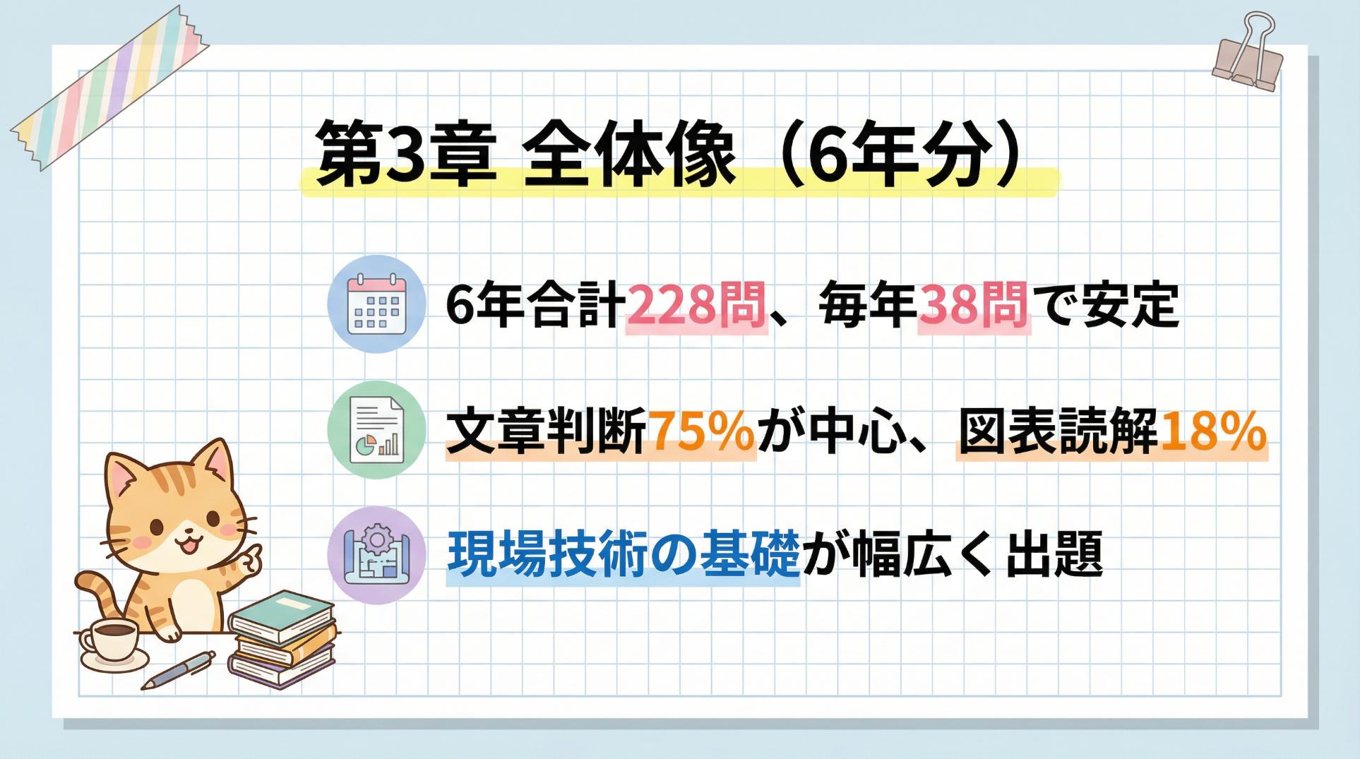 このページでは、2019年度と2021〜2025年度の6年分・合計228問のデータから、第3章(現場技術の知識)の出題傾向を読み解き、令和8年度試験に向けた最短ルートの学習戦略をお伝えします。