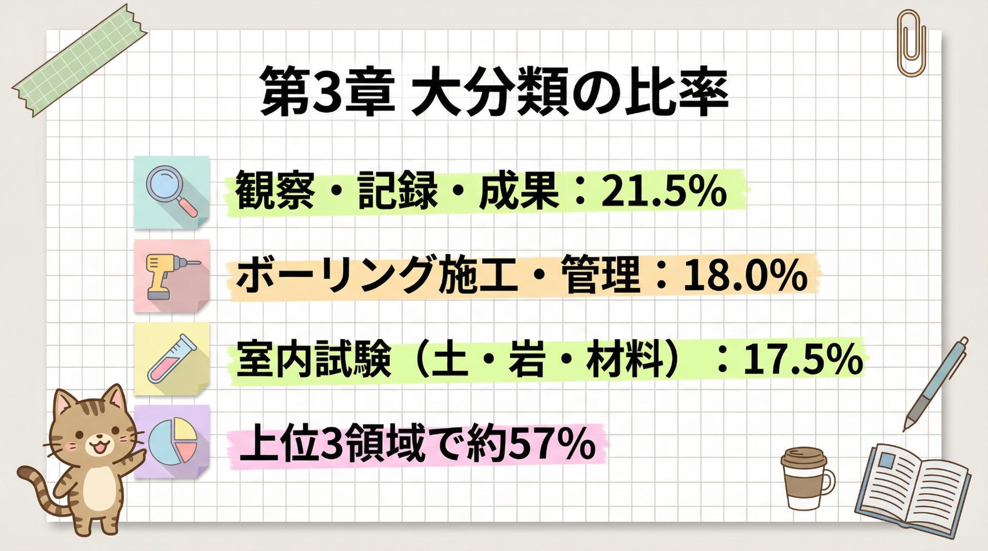 上位3領域(観察・記録/ボーリング施工/室内試験)だけで57.0%を占めます。